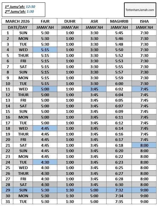 Assalamu 'alaikum wa rahmatullahi wa barakatuh, Ever been unsure of what time the prayer is at your local masjid? Worry no more. Alhamdulilah, it gives us great pleasure to bring to you a one stop salah timetable platform for the Tottenham community. We ask Allah to bless this work and bring our community together and we ask you to inform your friends and neighbours about us. JazakumAllahu Khayra Tottenham Jama'ah View all posts by tottenhamjamah